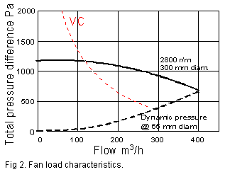 vacuum cleaner fan, shows a very high pressure at low flow, dropping considerably