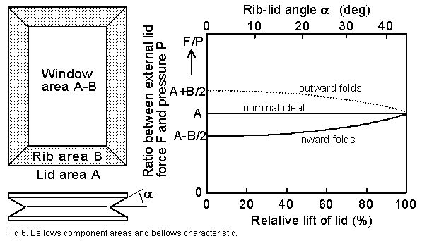 F/P = A ± B*0.5*(sin(a)*tan(a)-cos(a)) [m2]where A is the lid area, B is folding rib area (one layer only, as seen in a top projection drawing of the bellows), and a is the opening angle of the folds. Plus sign for inward folds, minus for outward. An important special case is at a=45 degrees, ribs at right angles to each other. Then the complicated coefficient for B becomes zero and pressure equals the nominal P=F/A.