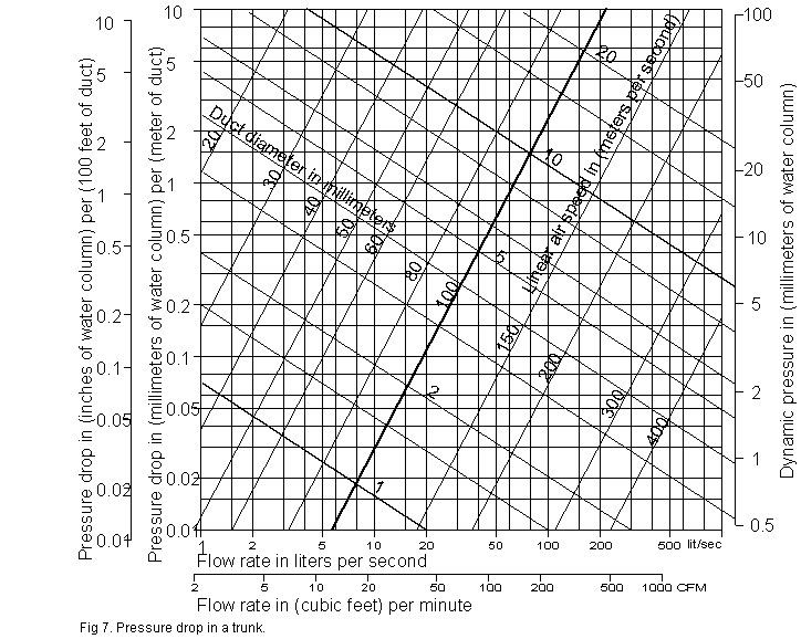 Step 1: Locate on a bottom horizontal scale the flow rate you are going to transport. Step 2: From this point move vertically until you intersect the (right upward sloping) line for the diameter of your trunk. Mark this intersection point. Step 3: Go horizontally to a left scale and find the pressure drop per unit length. Step 4: Multiply with the length of your trunk to obtain the total pressure drop due to viscous friction. Step 5: At the intersection point of step 2, find from the right downward sloping lines what is the linear speed of the air inside the trunk. Step 6: Follow the direction of these downward sloping lines to the right scale and read the corresponding dynamic pressure. |