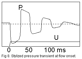 | During the first 30 ms interval the rarefaction wave runs to the reservoir and then comes back, apparently with fresh air. During that time interval the 10 liter/second flow means we would consume DV=0.3 liter=0.0003 m3. Suppose we connect a capacitance container at the receiving end hoping to let this one supply the necessary air while we are waiting. Also suppose we will accept a pressure drop DP=250 Pa (2.5 cmWC, 1 inWC). The container must then have a capacitance C=DV/DP=0.0003/250 and with the above formula we find its necessary volume to be V=C*rc2=0.0000012*1.2*3432=0.169 m3 (6 ft3). Probably we would not accept such a big device for the purpose. |