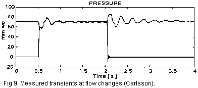 An additional important feature with a regulator is its stability. Theoretically, the simple regulators considered here are mass-spring systems, so called first order, which should always be stable. But even within this narrow scope practical solutions are not always so, there may be additional elastic and inertial elements introducing extra delays and a more complicted higher order behavior. In particular the load can make for problems, it may for instance be another trunk where waves can propagate back and forth like in example 5 and present a complicated situation for the regulator. Also the wedging action of bellows ribs may cause a negative acoustical capacitance (meaning pressure goes down rather than up when you inject an air volume) which in itself is enough to trigger instability.