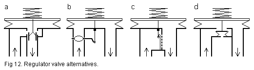 Fig. 12 shows four regulator variants a - d. In all cases the unregulated input enters at the left side, and all have the same sensor element at the output, namely a bellows at top where the lid area and the spring force define what the regulated pressure is going to be. An essential feature for a good regulator, and for all these, is that the input unregulated pressure does not put any direct force on the sensor, neither any force to operate the valve - the output pressure should be independent of the input..