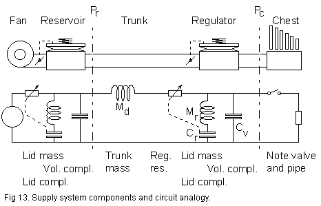 #1. A 'distant' branch comprising the trunk, slowly reacting because of the inertia of the enclosed air mass. From the definition of acoustical mass we can estimate a characteristic time constant like in example 4 Dt=(Md*DU)/(Pr-Pc). A high acoustical mass Md for the trunk and a large flow increase DU will make it takes a long time Dt before supply stabilizes. You can shorten that time by widening the trunk (decreasing Md) or increasing the regulator margin Pr-Pc, the pressure difference between reservoir and chest.