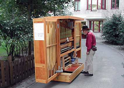 The man adjusts his wide brimmed hat and lights his cutty, obviously content with his self-playing organ and the enthusiasm it raises, not the least in the children. The man in question is Johan Liljencrants and the scene, if not for all the cars, could have been fetched from the century before last. From the organ pipes flows anything from Verdi through ragtime and the Beatles. On one gable is a schematic overview showing how the instrument works; a headline tells that this is 'The JoLi organ - a boy's dream materializing'. So this is a self construction, just recently finished, which took five years to carry through. Liljencrants was inspired in his youth when visiting Amsterdam, where self-playing instruments can be heard here and there in the streets and squares. Returning home he made a small busker organ, but could not abandon the thought of a street organ. He was educated as an engineer and became a professor at the Institute of Technology, where he did research in synthetic speech. To have this idea in your mind - and carry it through - you probably must have that type of background. The equally astonished and ignorant visitor to Liljencrants' combined workshop and studio at Dyer's Court Square in North Hammarby Harbour will certainly realize this. Outside the porch door he has an enchanting little garden with a fountain. His apartment is in the same block, close enough that he can wave to his wife. It is in the workshop that the organ is parked and there he sits by the computer making new arrangements for an increasing repertoire. Via Internet he carries on a perpetual, sometimes wild, discussion with other organ builders around the world. There is a conservative trend and one more modern, we understand. “I call the too-tradition-bound people image-makers. For instance some maintain that nothing less than rosewood is good enough for the pipes, while I have shown that just any species will do”, Liljencrants says. He even made pipes from a table leg. The frame of his organ is made from a couple of old double beds and a wardrobe. This wheeled instrument weighs a hefty 360 kilos and with this materialized boy's dream the 68 year former professor pulls out into the city, mostly on weekends. He has been all the way to Citizen's Square. There it started raining. Luckily a tarpaulin is part of the equipment. And he has plans for getting an auxiliary motor. Johan Liljencrants is also an aquarellist. And he makes little models in bottles. One depicting Stadsgården with boats and harbor buildings would be something for the Town Museum. And he is known as a kite builder. When the School of Decorative Arts arranged kite festivals at Gärdet he could be seen in his characteristic Spanish cloak, almost looking like a kite himself. Now this activity is down and Johan Liljencrants has had other things at hand in recent years. Rolf Broberg, rolf.broberg@dn.se Net note: Those wanting to go into organ