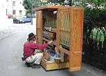 A big cupboard comes rolling down the sidewalk along Ring Road. At the front a slightly bent man is pulling it. It looks heavy. What is this - a removal? At the Southerman Street corner, the carriage stops and the man unfolds its doors. He bends down, and after a while, the most singular tones are heard from the contraption.