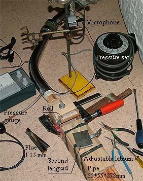 My chaotic lab set up on the floor is seen on the photo. Audio was picked up only 0.3 m (1 ft) away to get rid of some room acoustics, and with a mattress piled up behind. The second languid was made from .7 mm iron sheet, slightly curved, with sides folded down. The distance between languids was set at about 6 mm at the mouth. Extends inward about 75% of the pipe depth. A narrow handle extends to the back pipe wall where it is held by a screw. Detail  photo attached.