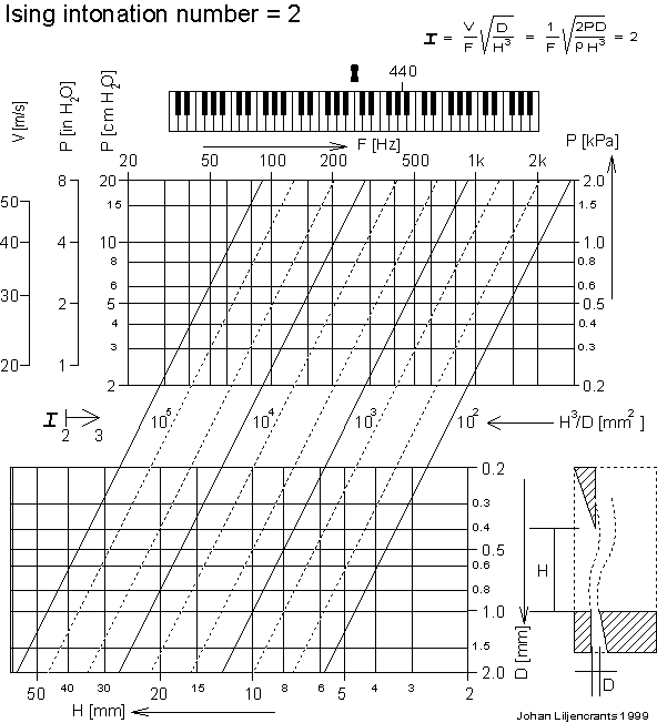 Intonation number The dimensionless intonation number I was developed by Ising as part of his dissertation in modeling the wave motion of the flue jet under influence of the acoustic flow. It represents an elegant formulation of the trading relations between jet initial velocity V, jet initial thickness D, cut-up height H, and pipe fundamental frequency F. When I=2 the jet has optimal conditions to drive the pipe fundamental. The essence is that pipes of different size/frequency but with the same general design and intonation number will also have similar voice properties. It does not account for various details like shape of the flue channel, nicking, or beards and bridges. The original formula is the left one in the figure, including the jet initial velocity V. For convenience my diagram instead uses the next alternative where V is (approximately) derived from the blowing pressure P, using the Bernoulli law. How to use Designing a pipe you would initially know pipe frequency F and pressure P. Mark the corresponding point in the upper rectangular diagram. Put a ruler through this point and parallel to the sloping lines, maybe draw a line. This line marks a constant value of H3/D and along it you can read corresponding pairs of values for H and D from the scales in the lower rectangular diagram. You can choose those within limited ranges, wide for D, narrow for H, all giving the optimal I=2. But be warned that this does not automatically mean the pipe will sound the same, for instance the (sound) power will obviously vary with D. And a change in H will require a minor adjustment in pipe length to keep F. You can also work other directions. For instance, with an existing pipe you could locate H and D in the lower diagram and then follow the sloping lines into the upper. Here you can find the suitable pressure once you know the frequency. Extra juggling Normally you might want I to be somewhat larger than 2 in order to enhance higher harmonics, but near I=3 the pipe will overblow. Following the slopes from the upper to the lower diagram you can also add a sideways translation to account for a higher I. The arrow at left, marked I 2->3, tells how much is required to reach I=3. The aerodynamically effective value of D can be somewhat smaller than the mechanical measure you find with a blade gauge. This is because of viscous friction boundary layer effects in the upstream flue channel. Pressure P is immediately upstream the flue and may differ from the main system pressure, for instance because of throttling in the pipe toe. Reference Ising, H: Erforschung und Planung des Orgelklanges. (In German; Exploration and planning of organ sound). Walcker Hausmitteilung Nr 42, Juni 1971, pp 38-57. ----------------------------------------------------------------------------- (Author JLs 990409) |