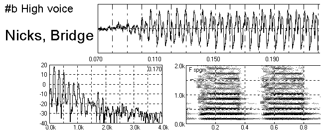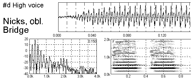 The bridge mounted in #a is 18 mm wide and has a curved inner surface like a cylinder of same radius. It was put about 7 mm outside the jet and allowed the cut up to be decreased appreciably. As a result the harmonics become much stronger. The short jet travel would mean jet is thinner at the labium than in the other cases and the switch time for the jet to cross the labium is shorter.