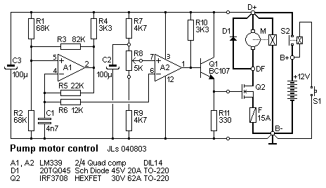 emitter follower Q1 for sufficiently fast drive to the power FET Q2. When everything is turned on by switch S1 and relay S2, the slow charging of capacitor C2 implements in a raw and simple way a smooth acceleration of the motor, no overly big start current. I did unsuccessfully try some ways to make an over current cutout by sensing the drop over the fuse F. Skipped that after all, did not seem too necessary. The fuse remains from earlier versions, but I doubt it is very meaningful. |