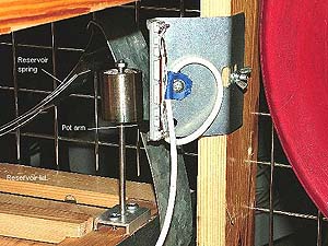 for future rationalization. In the background of this photo you see the feeder drive motor with its control box and its intermediate gear shaft. These are mounted on a cradle, pivoting around rubber washers, one of them seen below the contact bar. The belt connecting the intermediate shaft to the crankshaft is tensioned by a spring, hardly visible below the intermediate gear wheel. |