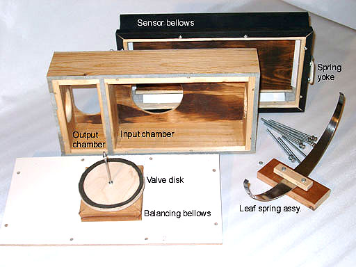 The top board is glued to the box frame toward the big sensor bellows. This cover has the circular valve seat and a big hole to let flow toward the output. The box bottom is a flat board where the balancing bellows is centrally mounted with a screw. The assembly is held together by eight long screws gripping Teenuts inserted into the frame of the sensor bellows, make for easy disassembly.