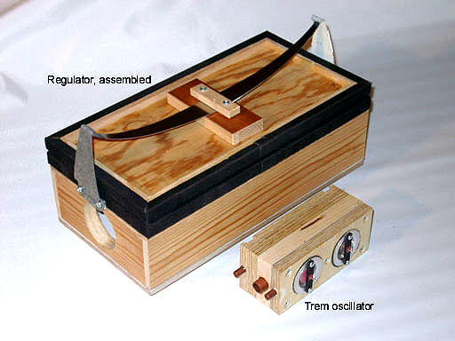 Here is a design for a small simple pressure regulator as I have finalized it after several pilot attempts, initiated by Zeb Vance who taught me about his Aeolian regulator. For my organ I have built four of these, one for each wind chest. A specific feature in this regulator type is a small balancing bellows, the interior of which is normally connected to atmosphere. A second use for this little bellows comes when you feed it with an externally supplied control pressure that will then modify the regulator output pressure. When this control is a pulse train of suitable frequency the regulator will operate as a tremulant. A particular merit of this principle, distinguishing it from conventional trems, is that it avoids power consumptive and noisy periodic air dumps. Instead the output pressure is actively controlled to pulsate. An oscillator to generate such a control signal, made from two pouch operated valves arranged into a feedback circuit is also described. This oscillator is believed to be an innovation in the art of organ building.