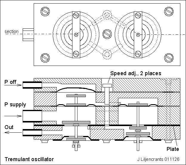 If you modulate the force on the moving armature, then the output pressure will follow. This is true irrespective of what is the air consumption rate as long as we stay within limits, essentially given by the capacity of the blower and trunking system. One may devise many methods to do this agitation for tremulant use, pneumatic, mechanic, electromagnetic, or whatever. But it appears one of the simpler is the method proposed here, to inject an intermittent control pressure into the balancing bellows, coming from the oscillator described below. When the balancing bellows is pressurized, that pressure, times the balancing bellows area, is added to the upward force on the armature. The valve then goes up (closes). The regulated output pressure drops by a corresponding amount, so that the same total upward force opposes the spring. In the present design the areas A and B relate as 9:1 suggesting that in tremulation the output pressure would oscillate between 100% (F/(A-B)) and 89% (F/A) of normal, if the control pressure is the same as the regulator output pressure. In my organ I drive the oscillator from the coarse regulated supply that is about 50% higher pressure, so the tremulation is correspondingly bigger, still perhaps quite modest. For heavier tremulation you might install an external bellows pulling the lid, possibly connected using an adjustable lever.