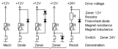 connection variants Four different electrical connection principles were tested, as outlined here. Diode stands for the inclusion of a freewheel diode to protect a semiconductor switch from over voltage when opening. Since such a diode will increase turn-off time, a few countermeasure alternatives were added. Zener stands for the inclusion of a 12 V Zener diode such that the voltage across the switch at turn-off is higher than the supply, but now limited to about twice that voltage. Also a functionally equivalent alternative is shown, but this time using a 24V Zener diode connected at a different place. The final variant examined is Resist where the magnet is series connected with a passive resistor, here arbitrarily selected to have the same resistance as the magnet coil. This requires the supply voltage to be doubled but speeds up the magnetic field collapse at turn-off. An additional merit is that turn-on is also speeded up since initial voltage to the magnet is then doubled. |