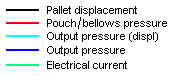 pressure characteristic is inverted.The action of this primary system is somewhat slower than those in the example above, one factor is because the bellows are bigger. The measurements below apply to the secondary bellows, operating the top pallet via a lever mechanism. The displacement of the output pallet was not measured here, but the secondary internal pressure graphs reveal the approximate intervals where the leaf of the secondary moves. These intervals (marked in red at top) are inferred from the plateau with an intermediate pressure. The difference between this intermediate pressure and the final pressure is the driving agent to move an airflow out of the secondary bellows, or into it in the turn-off case. |