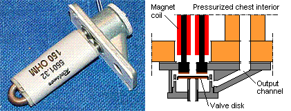 150 Ohms resistance, driven with 12 Volts. Initially, consider the actions within this device. The first delay component is electrical in nature. When the drive voltage is switched on, the current and the magnetic force on its armature will grow only gradually toward the stationary values determined by voltage and resistance. This is because of the inertial inductance of the magnet coil. At some point the magnetic force is enough to pull the armature, being a small magnetic disk, against the force developed on it by the air pressure. The disk then flies toward the magnet and the output is switched from chest pressure to atmosphere in another few milliseconds. When the electrical switch is opened for turn-off the inductance of a bare magnet induces a violent voltage spike that would cause arcing in a mechanical switch, or immediately kill a semiconductor switch. To avoid this it is customary in semiconductor switch designs to install a freewheel diode to limit the voltage excursion to the supply voltage. A consequence of the diode is however that it will take some more time until the energy of the collapsing magnetic field has been dissipated in the coil resistance, such that the valve disk will return. |