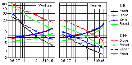 speed Turn-on times increase with pressure since the drive current and magnetic force must go higher before the pallet is moved. It is seen that turn-on times are the same for all drive alternatives except Resist where the doubled initial magnet voltage increases speed. Turn-off times go down with increasing pressure for an analog reason. But a most striking feature is that the electrical connection alternatives gives such a marked difference in turn-off times. This is a memento in restoration work where the original Mech variant might be substituted by the Diode alternative, should a modern solid state relay be installed. This will overthrow an earlier balance between on and off times. While turn-on remains the turn-off times might then increase enough to be musically relevant, notes being slightly prolonged. |