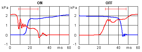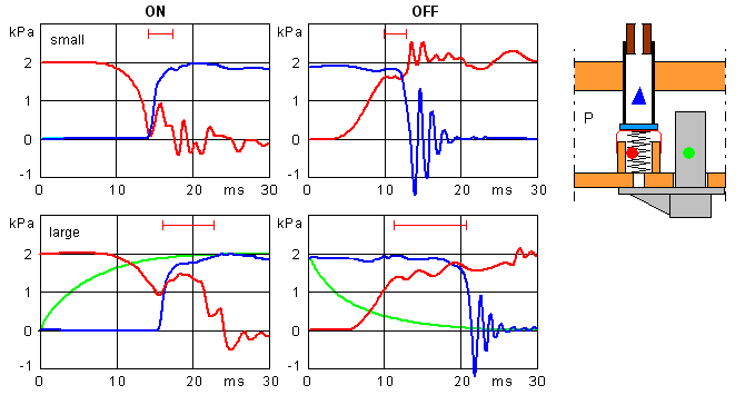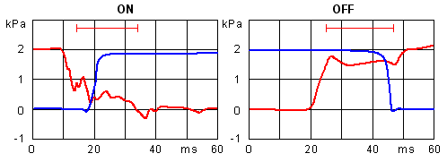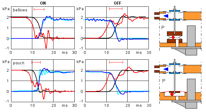 resonances in the cavities, channels and probe tubes.The internal red traces reveal actions in some detail. First look at the left graphs for the turn-on sequence. At time 0 voltage is applied to the magnet and at 7 ms the current has grown enough that the magnet valve begins to open and the red trace begins to drop. At 10 ms the bellows/pouch force has grown such that the upper valve disk is pulled off its seat against the chest pressure and the valve stem moves to its opposite position in the following 3 or 4 ms. That transition flight is somewhat faster in the pouch driven valve, presumably because of its smaller moving mass. During the flight a volume of air has to evacuate through the magnet valve. This volume is greater from the pouch cavity than from the bellows interior, apparent from the different plateaus in (red) pressure from 10 to 14 ms. The armature flight intervals are marked in red at top of the diagrams. At the end of flight the lower valve disk hits its seat to stop the armature, and the blue output pressure is up. Also the bellows/pouch red pressure goes to zero as evacuation stops abruptly, evoking strong transients. The turn-off sequence graphs in the middle show very similar behavior and timing. The noteworthy thing is the intermediate plateau in the red internal pressure graphs during the valve stem flight from about 11 to 16 ms. In this interval the pressure difference between bellows/pouch interior and the chest drives the airflow to refill the interior. The difference between the bellows and pouch driven alternatives appears to be insignificant. It is rather up to the designer to select which alternative to use with respect to practical issues like component count and available space. |