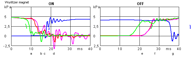 The Reisner magnet at 2 kPa. The small green and blue marks show the time-wise translation of the patterns at 5 kPa. The Wurlitzer magnet at 5 kPa. The small green and blue marks show the time-wise translation of the patterns at 2 kPa. Some identifiable events are marked with letters in these diagrams: a: The magnet pallet has opened and the primary bellows begins to evacuate. b: The primary valve armature hits the upper seat and primary evacuation stops suddenly giving a negative pulse in the green trace. Meanwhile the secondary bellows has begun to develop a force on the main pallet, but is not yet moving. c: The force from the secondary bellows has built up enough to tear the main pallet open against pressure, blue output pressure starts to rise. Once this happens the force from the secondary drops momentarily, to tension only the pallet spring. The secondary starts moving with a jerk and a corresponding puff of air gives a positive pulse in the violet trace. This signifies the acceleration of the air in the channel. There is little seen of it at test point 2 (red) close to the vented end. d: The main pallet is fully open and secondary bellows motion is stopped against the felt rail. The abrupt stopping of the secondary evacuation flow gives a negative pulse in the violet trace. The extra pulse in the Wurlitzer trace at 31 ms suggests that the bellows and pallet spoke return once more against the stopping rail after a bounce. e: The magnet pallet reaches home position and the primary bellows begins to refill and its armature moves back down. f: The primary armature slams shut. Secondary bellows refill has already been started mildly, but now proceeds at full speed under control of the pallet spring force. g: The main pallet is slammed shut and the secondary motion stops. From now no air is consumed, so the inertia of former flow in the supply hose induces a slow rise into overpressure. |