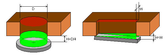 The area opened up by the activated pallet is marked in green in these sketches. This is compared to the nominal area of the valve, here marked in red, as given by the seat diameter, or by length times width for a slot. The definition of a fully open state of the valve is taken that the 'green' and 'red' areas are the same. From that and simple geometric calculus (forgetting about a narrow end section for the slot pallet) these elementary rules follow: A circular valve is fully open when the disk is moved one quarter of the seat opening diameter. A slot valve is fully open when the free pallet end is moved as much as the width of the slot. If the pallet is opened less than these rules prescribe, then there will be an obstruction to the flow, potentially causing an undesired pressure drop. In many cases this is insignificant, since the valve seat may be over dimensioned for reasons of conservation or size standardization. Furthermore, there is no merit in opening the valves more than these rules suggest. Rather a loss, as this would increase the time taken for opening and closure. |