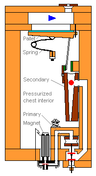 magnet air passage area from chest to magnet control output. To conclude it seems practical to omit the primary valve as long as the (formerly) secondary bellows is in good shape. The little increase in turn-off time is not very significant. This time may be shortened by increasing the tension of the pallet return spring, but this would decrease the margin that the bellows can develop enough force to open the pallet at turn-on. |