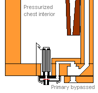 indicate the time intervals the bellows is contracting and expanding.It appears that turn-on time is insignificantly changed. The air passage to evacuate the bellows is now more narrow, but any consequent slowdown is compensated as there is one less stage of valves in the action chain. One should however note that the bellows must be in good shape with a small air leakage. This is not as important when you have a primary valve presenting a larger area to evacuate it at turn-on. |