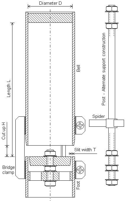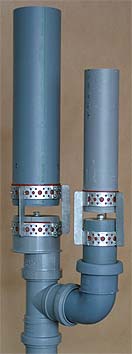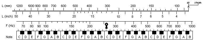 4. Demonstration modelThis photo shows two rather unromantic whistles fabricated like in the drawing above, from 75 and 50 mm (3 and 2 inch) PVC drainage tubing. The internal disks are turned from 1/2 inch plywood to press fit tolerance. Their notes using the 3:1 scaling rule form the fifth interval G and D. Since the bell tubes are made with about 30% excess length they can be tuned down as far as to a fourth lower by pushing up their top disks to increase L.These two whistles were simultaneously blown from an industrial fan that delivers about 4 kPa pressure (17 inWC, 0.6 PSI) which results in about 115 dBC sound pressure level at 1 meter distance. Slit widths are 1.0 and 0.8 mm respectively. The whistles are connected to the fan with a T joint, such that the fan is free blowing through the third opening of the joint. The whistles sound when this opening is covered with the hand. In the sample the higher whistle is tuned down to #C to form a diminished fifth interval. |