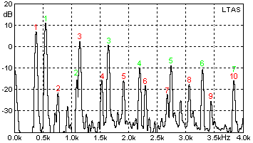 and a weak titter from sparrows. In this spectrum of the sound the harmonic numbers for the 3 inch whistle 370 Hz G are identified with red figures. Harmonics for the 2 inch 550 Hz #C with green. |